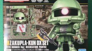 ガンプラくんシリーズの一つ、1/1 ザクプラくんについて書きました。可愛らしく2頭身にデフォルメされたプラモデルで、通常時(モビルスーツ)とランナーver.を選択して組み立てるようになっています。完成写真を掲載。